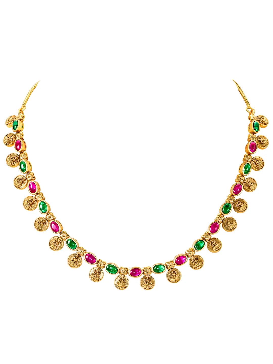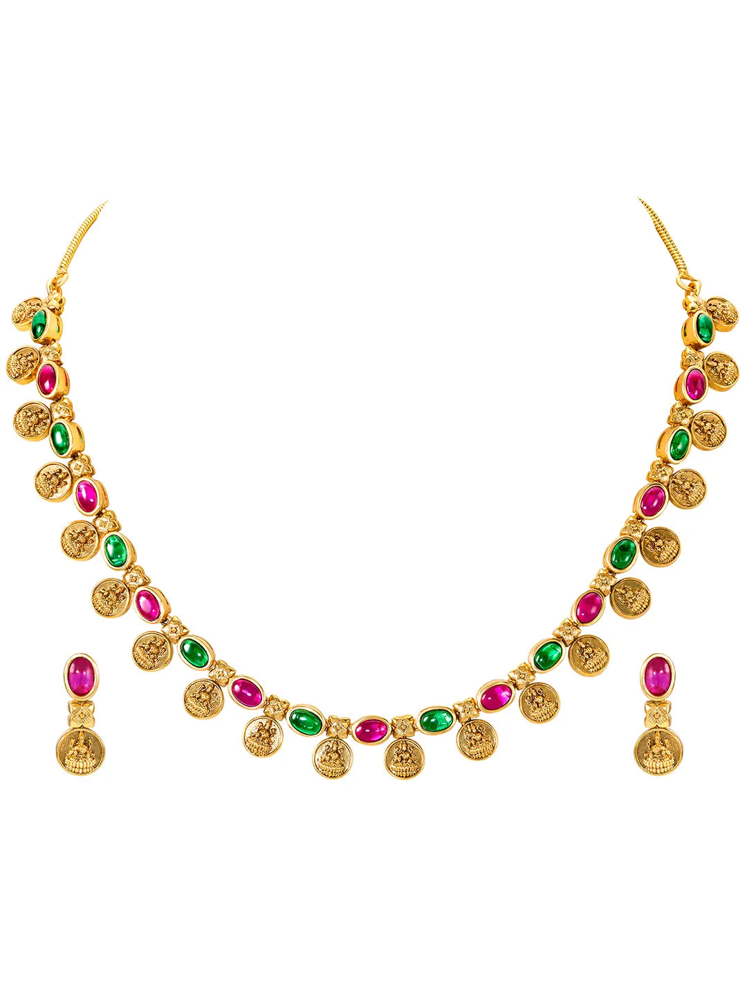 Product Name: Lakshmi Coin Necklace Set with Pink & Green Stones