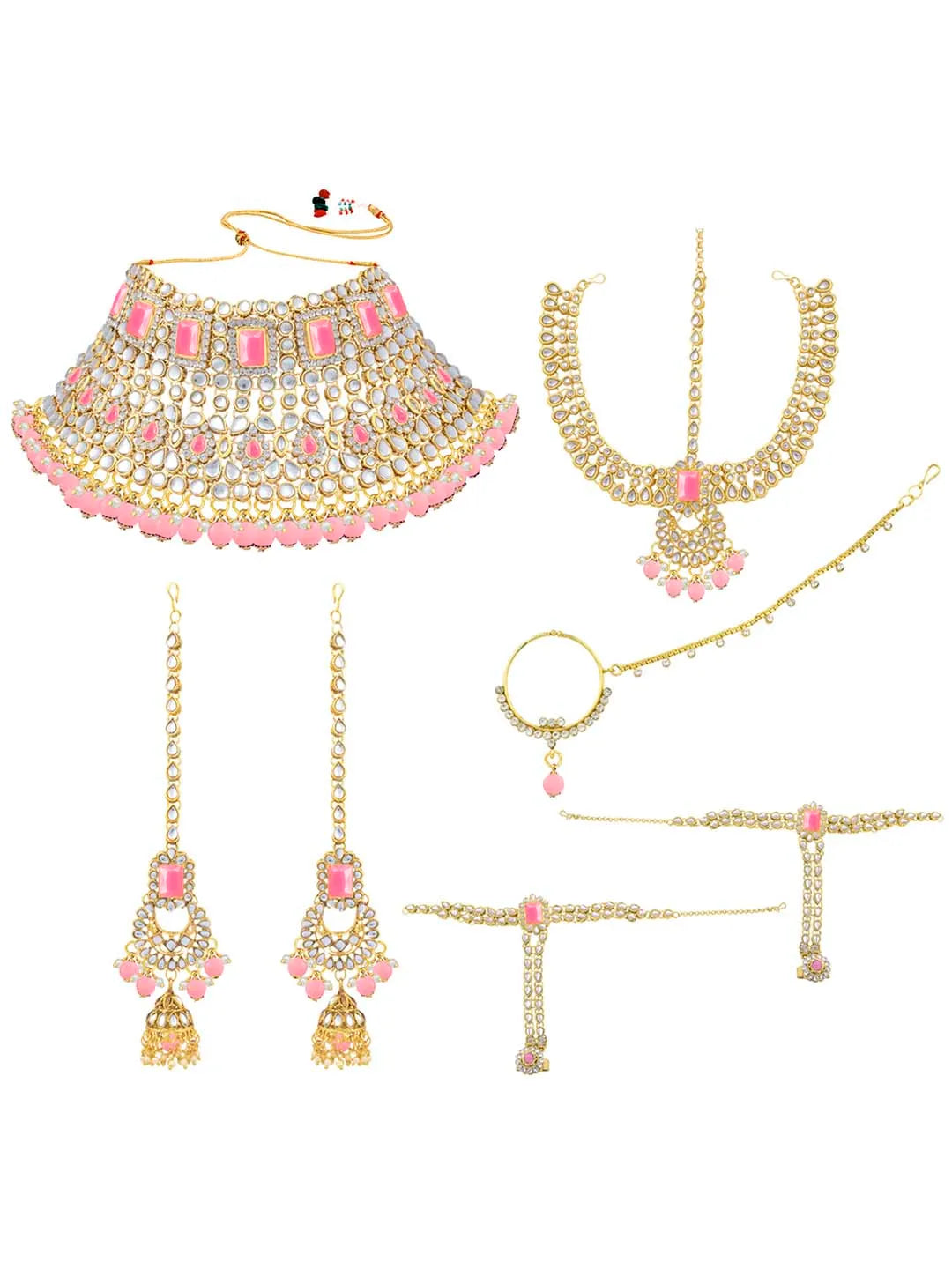 In the Box: 1 ChokerNecklace 1 Pair of Earrings 1 Matha Patti Maang tikka 1 Pair of Hath Panja 1 Nathiya