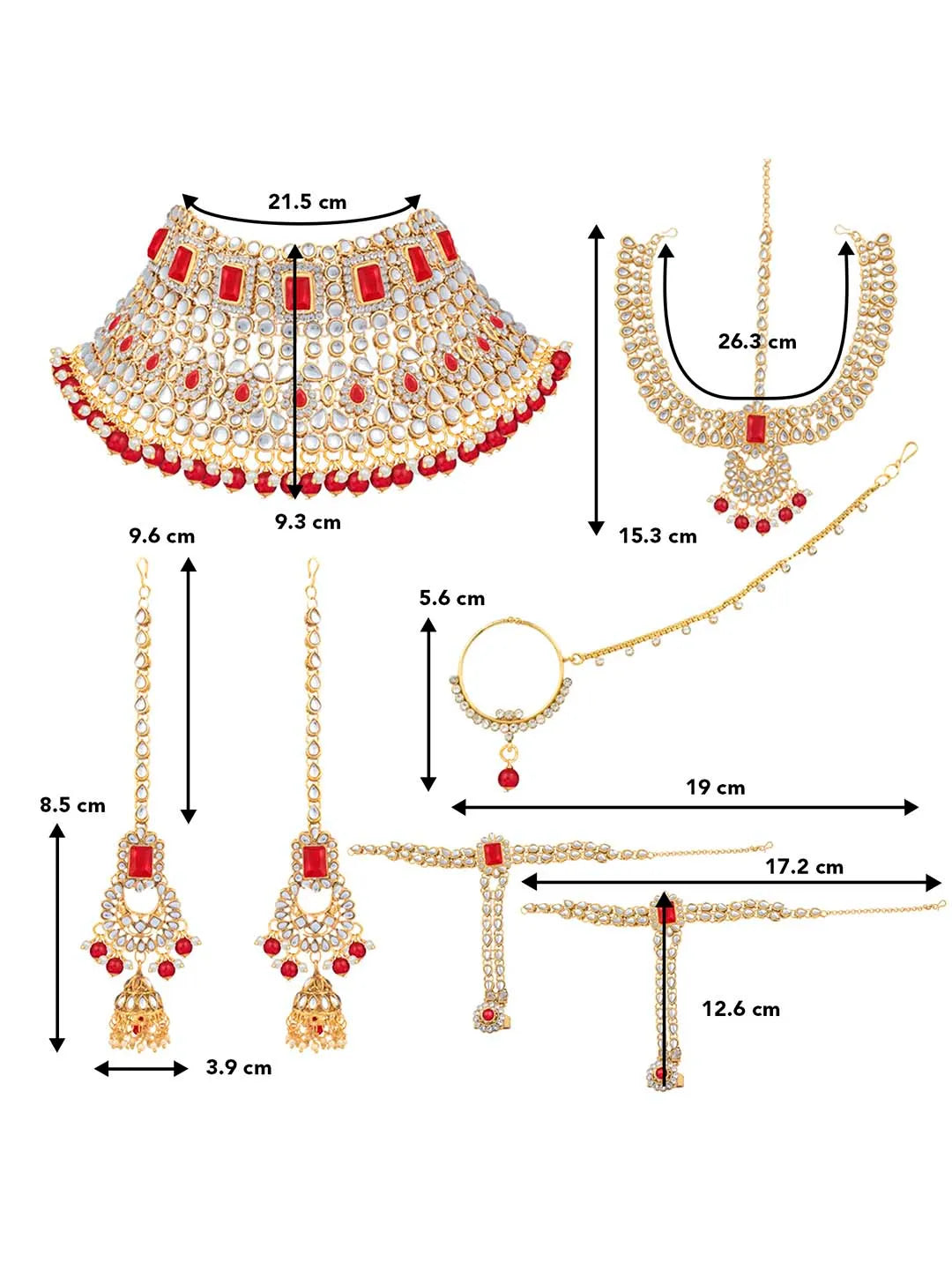Dimensions: Necklace Length: 21.5 cm Width: 9.3 cm Earrings Length: 8.5 (Ear Chain-9.6) Width: 3.9 cm Nose Pin Ring-19 cm 5.6 cm Haath Panja Length: 17.2 cm Width: 12.6 cm Matha Patti Length: 26.3 cm Width: 15.3 cm