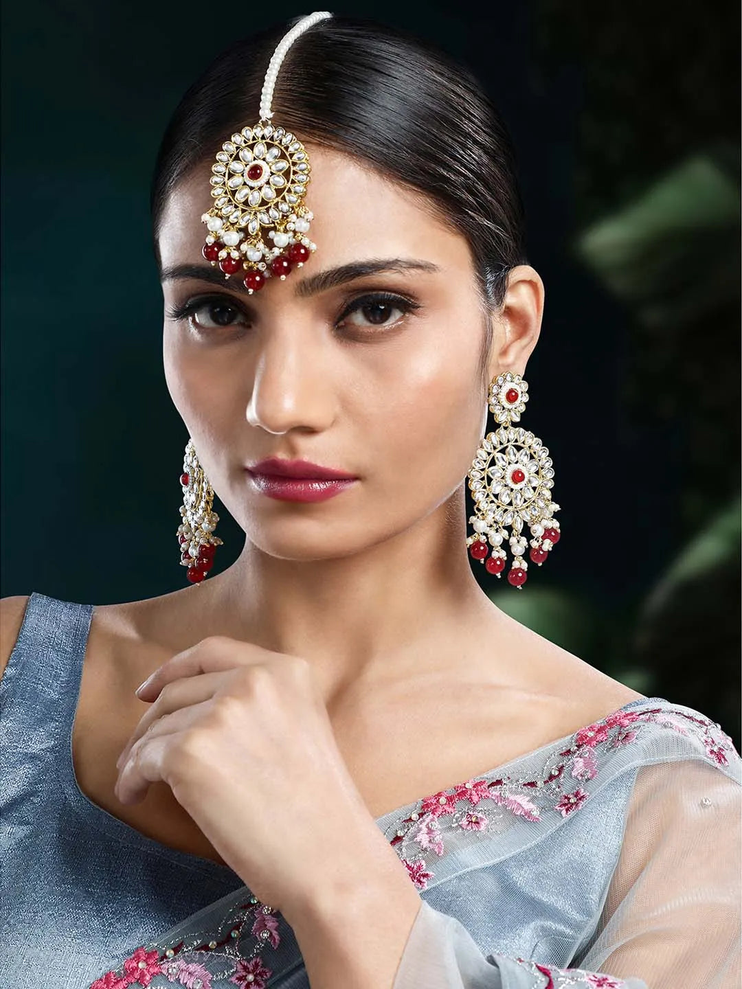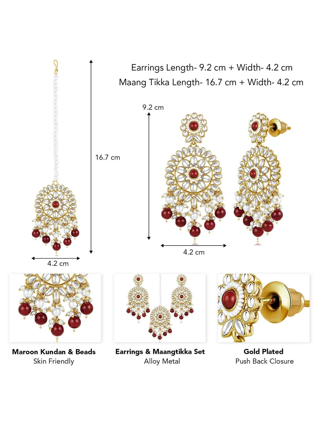 Dimensions: Earrings Length: 9.2 cm Width: 4.2 cm; Maangtikka Length: 16.7 cm Width: 4.2 cm