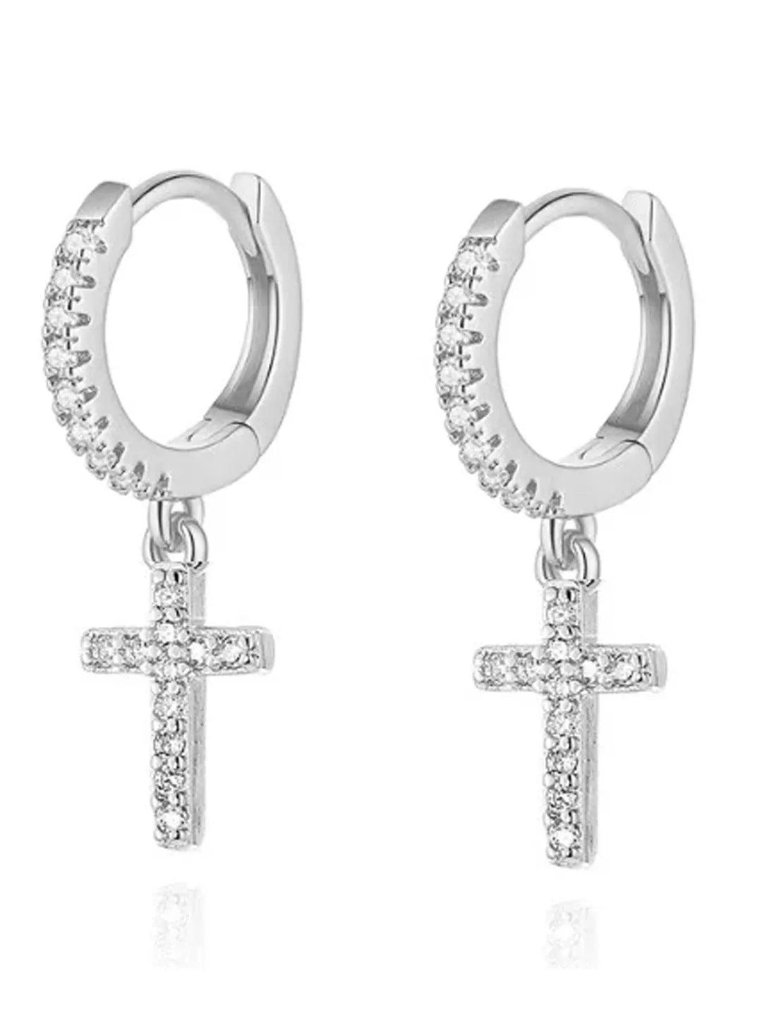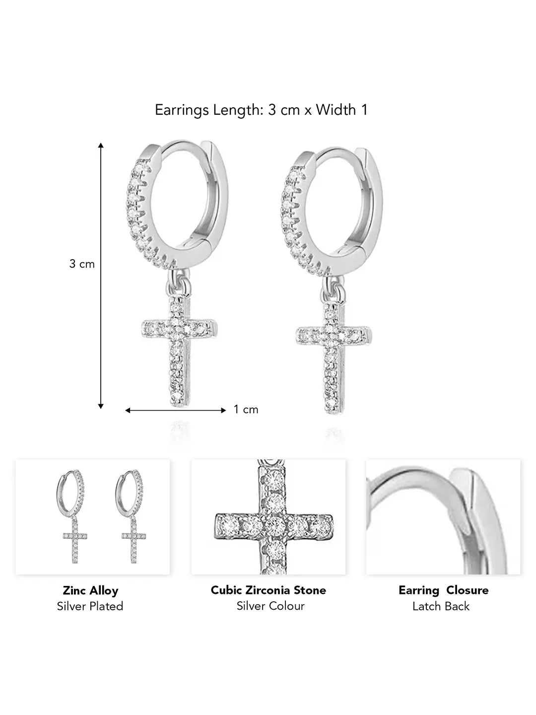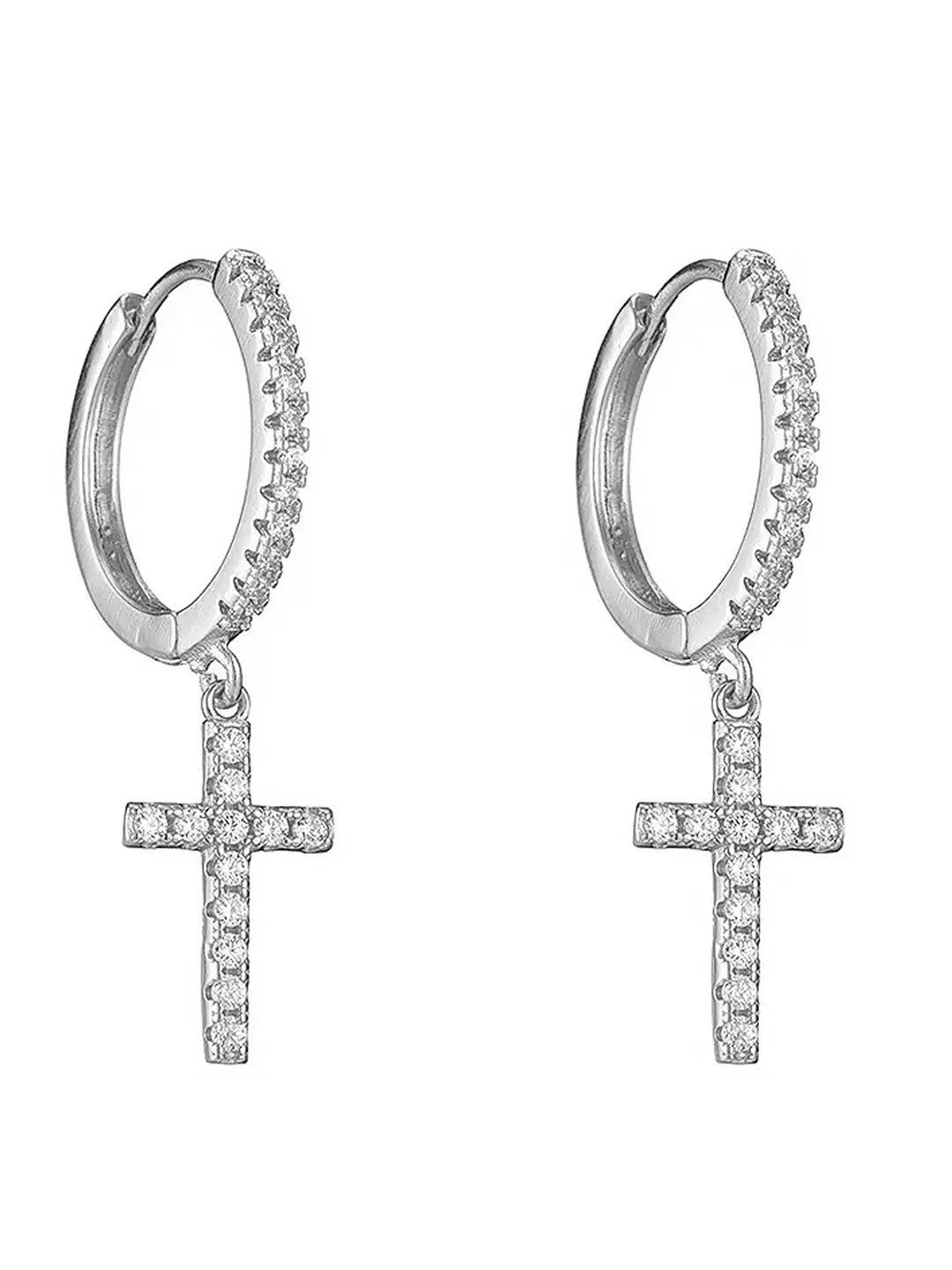 Product Name: Cross Design CZ Studded Hoop Earrings - Silver
