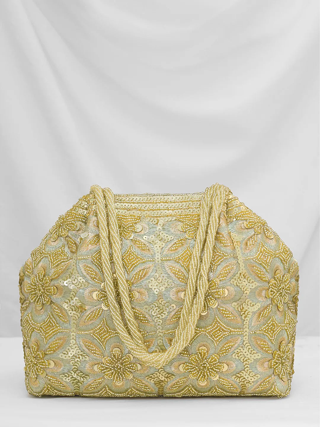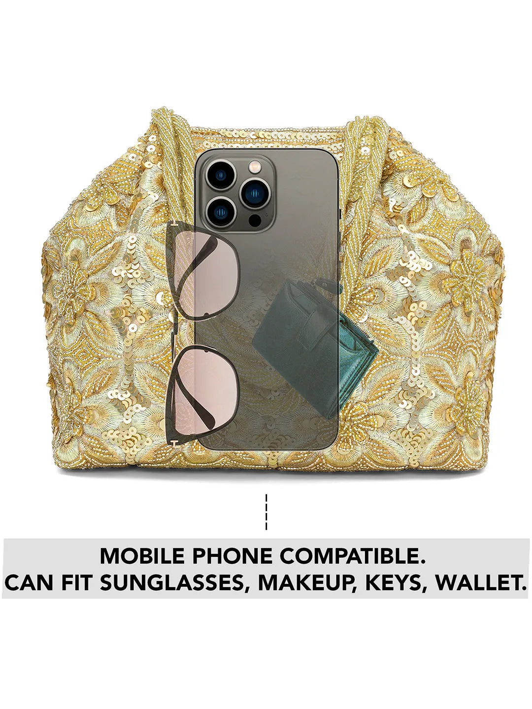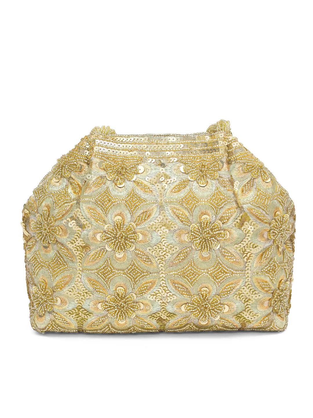 Product Name: Floral Embroidered Clutch with Beads - Golden