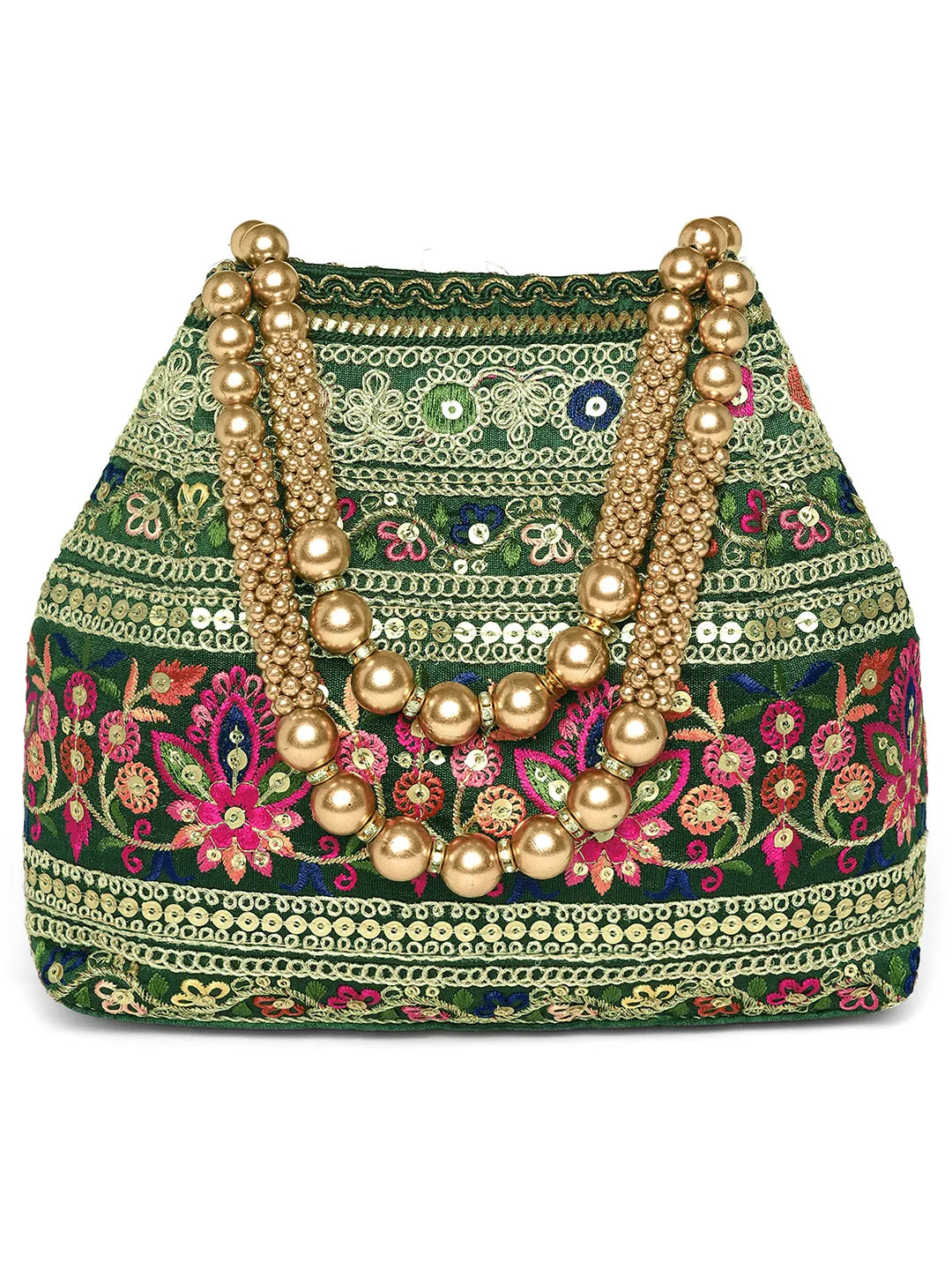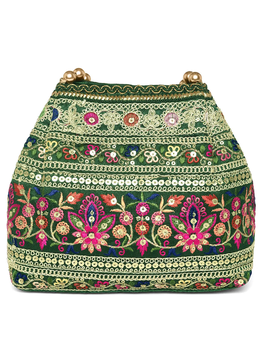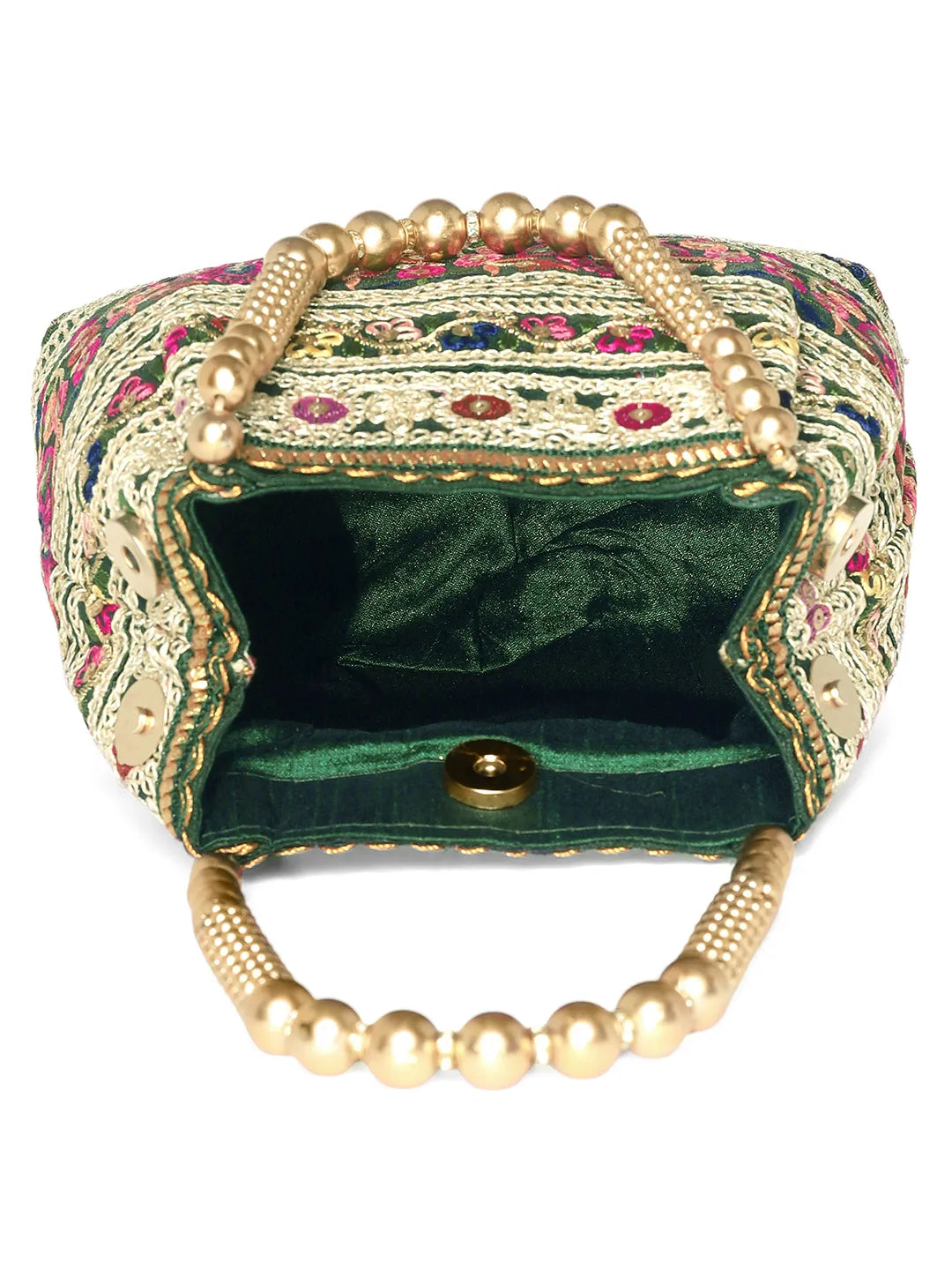Product Name: Floral Threadwork Potli with Bead Handle - Green