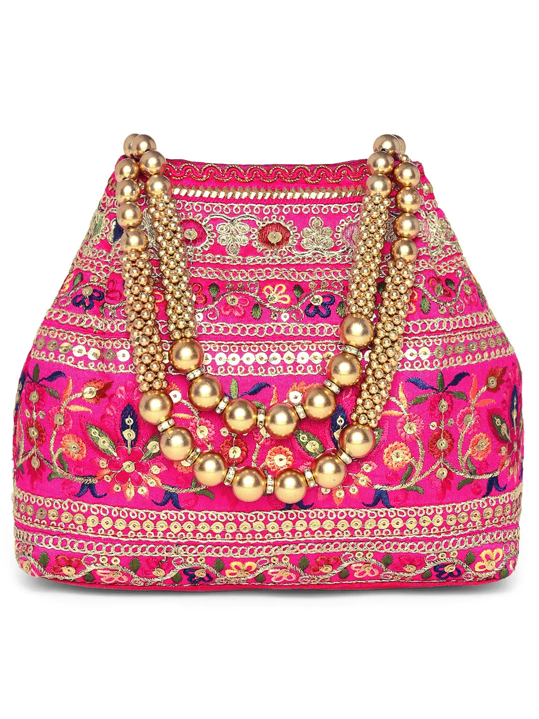 Product Name: Floral Threadwork Potli with Bead Handle - Rani Pink