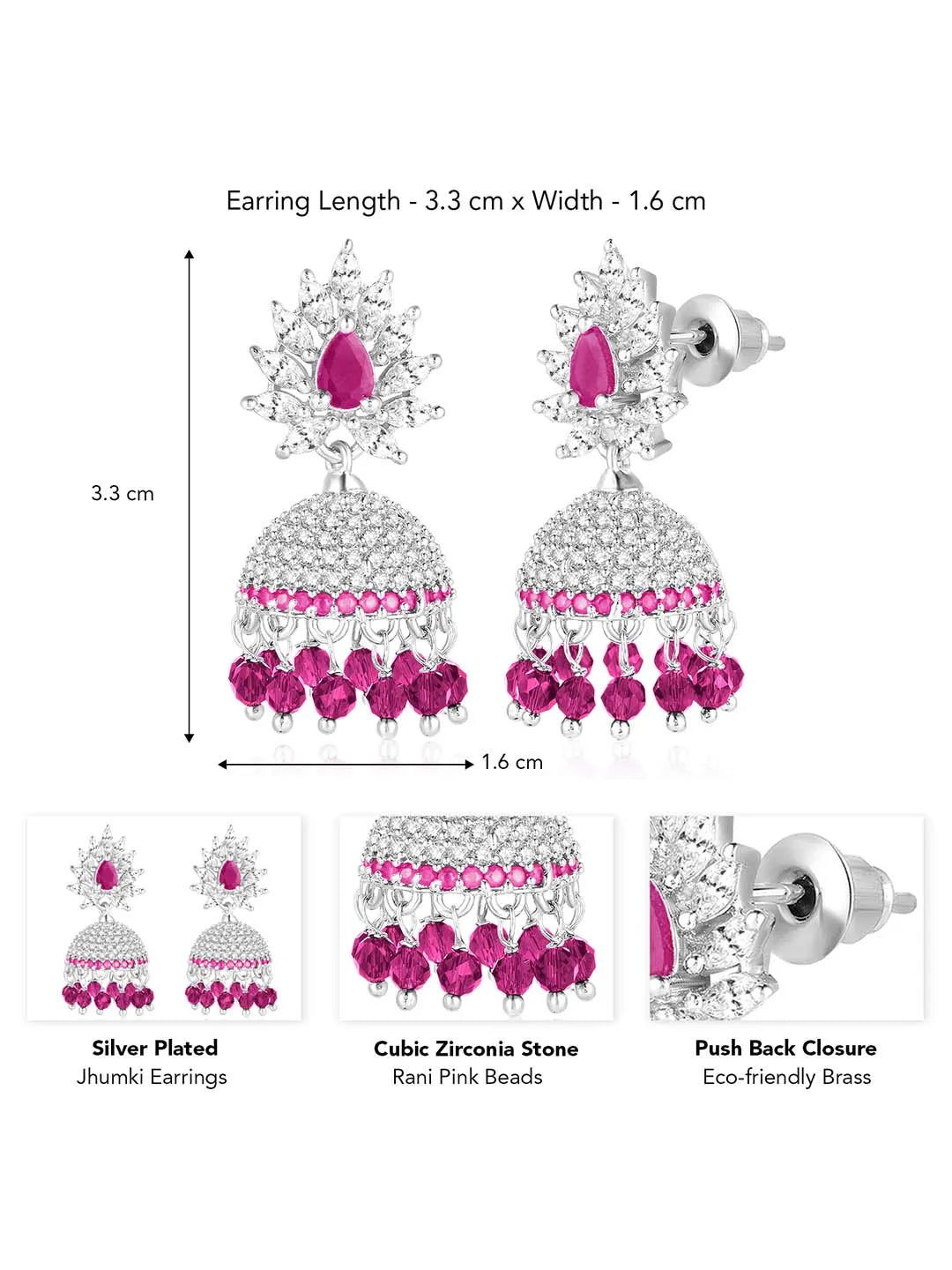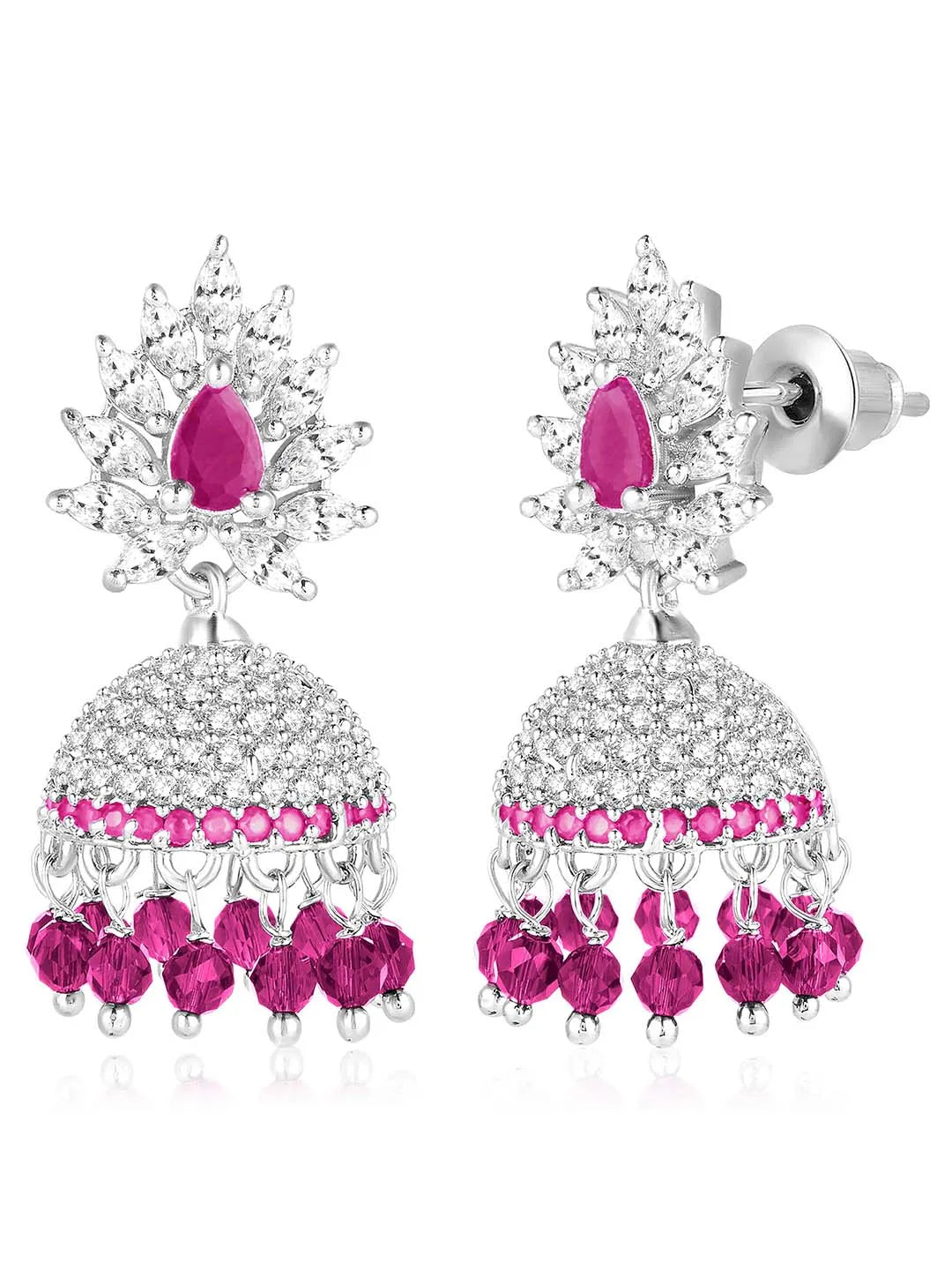 Product Name: Gleaming Elegance CZ Jhumki Earrings - Silver Rani Pink