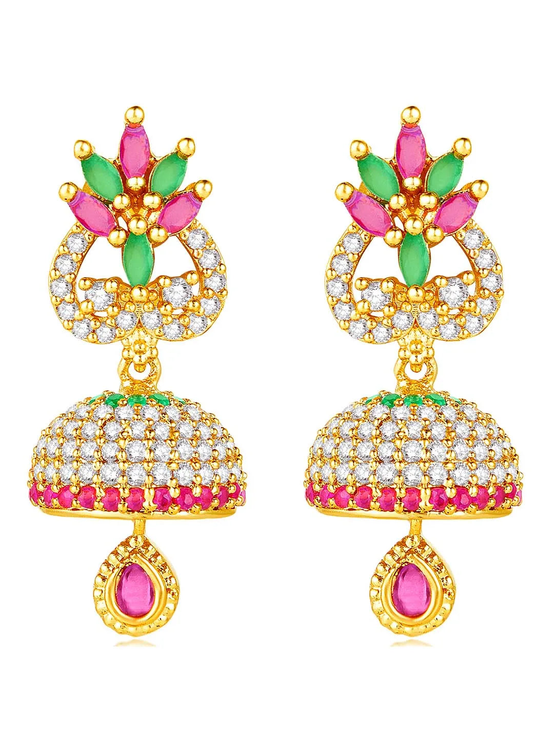 Product Name: Glimmering CZ Drops Jhumki Earrings - Rani Pink Green