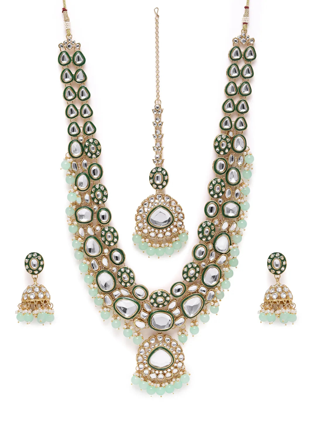 Dimensions: Necklace Length: 51 cm Necklace Width: 9.5 cm Earrings Length: 6.1 cm Earrings Width: 2.5 cm Maangtikka Length: 21.2 cm Maangtikka Width: 4.2 cm