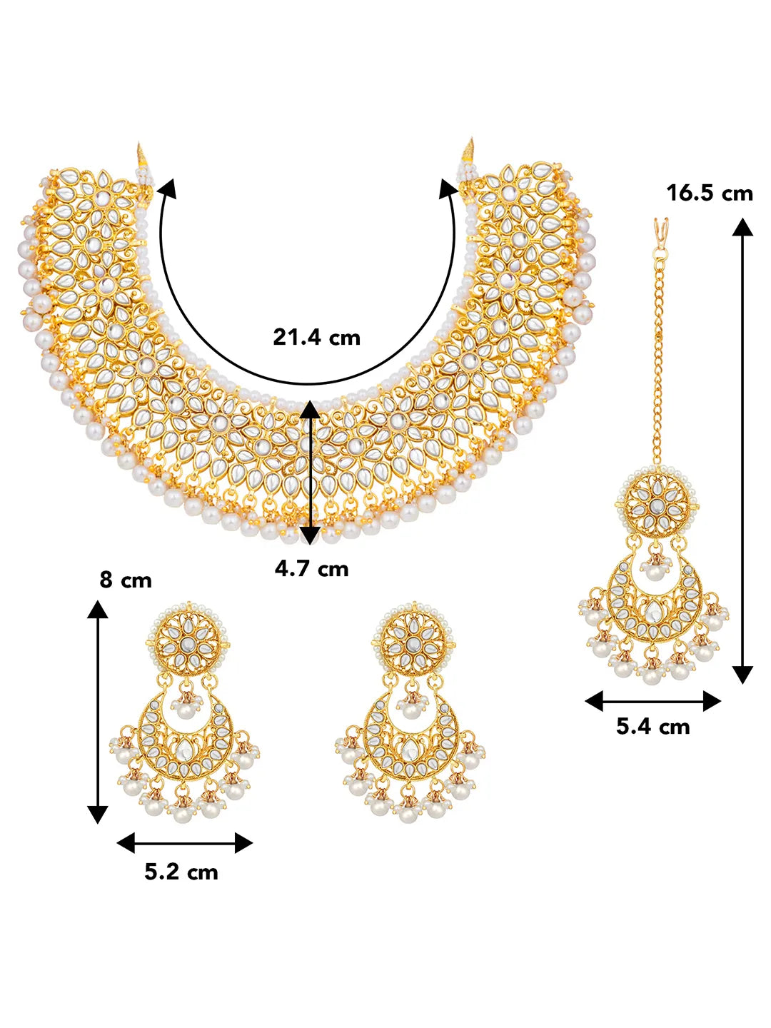 Dimensions: Necklace length : 21.4 cm Necklace Width : 4.7 cm Earring Length : 8 cm Earring Width : 5.2 cm Maangtikka length : 16.5 cm Maangtikka width : 5.4 cm