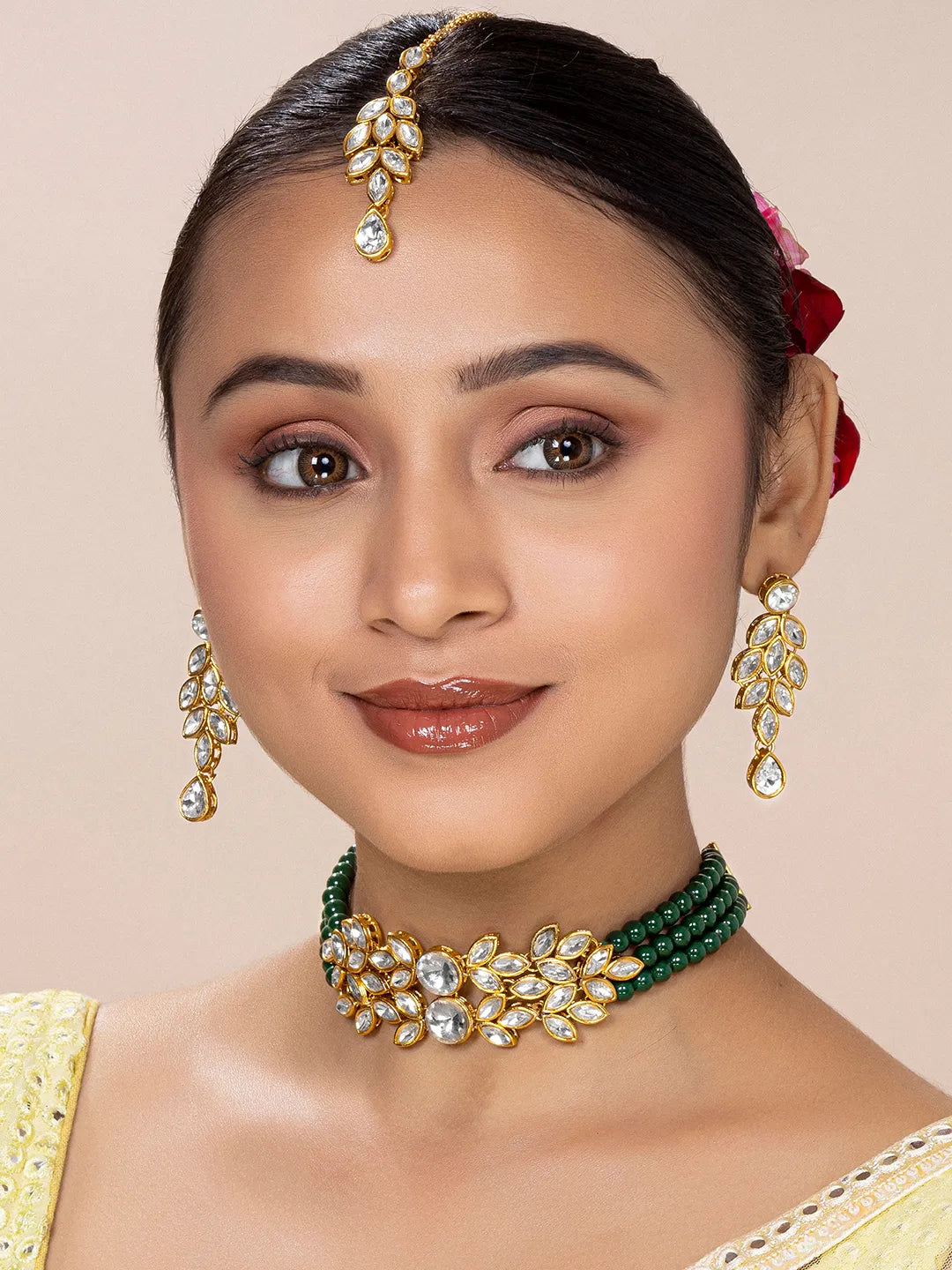 Dimensions: Necklace Length: 24 cm X Width: 2.8 cm; Earrings Length: 5.9 cm X Width: 2 cm; Maangtikka Length: 15.1 cm X Width: 2 cm; Weight: 85 Grams