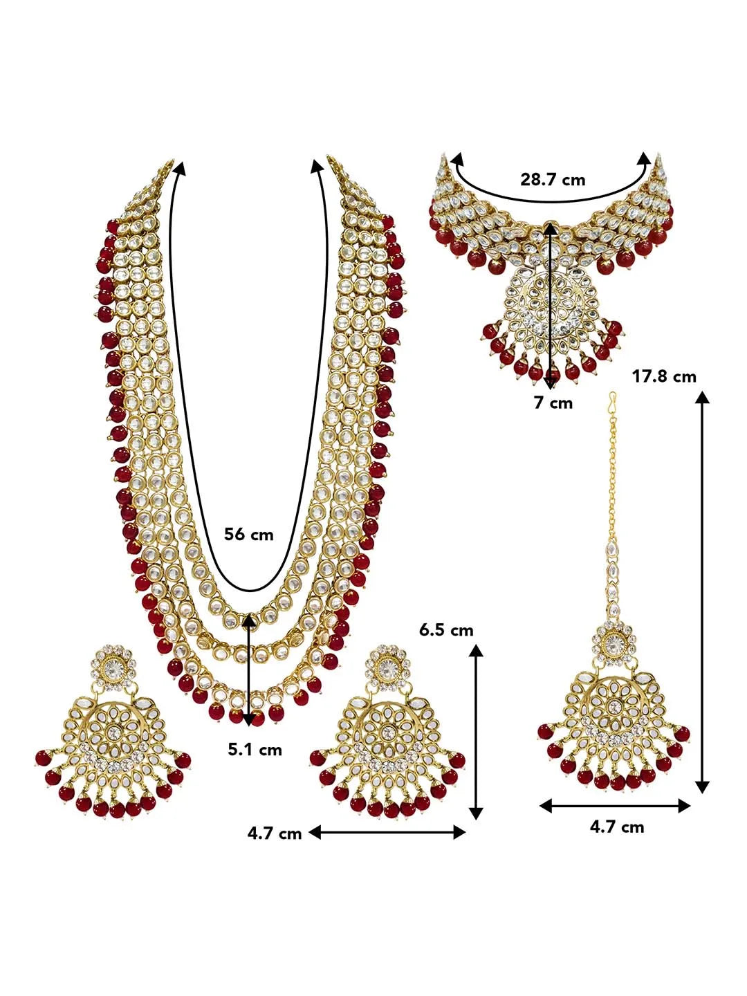 Dimensions: Long Necklace Length: 56 cm Width: 5.1 cm; Short Necklace Length: 28.7 cm Width: 7 cm; Earrings Length: 6.5 cm Width: 4.7 cm; Maangtikka Length: 17.8 cm Width: 4.7 cm;