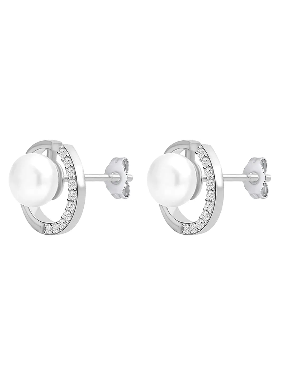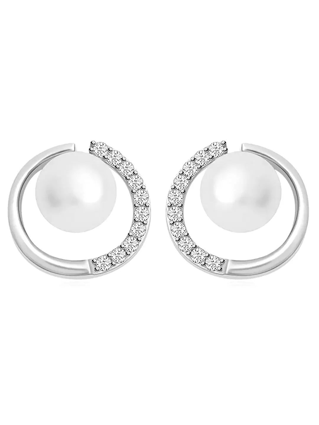 Product Name: Modern Pearl & Crystal Curve Earrings - Silver