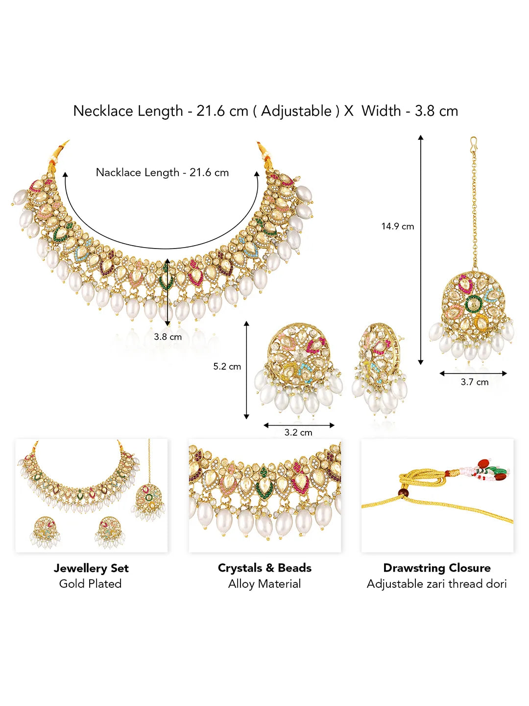 Dimensions: Necklace Length: 19.5 cm Necklace Width: 3.7 cm Earrings Length: 5 cm Earrings Width: 4.2 cm Maangtikka Length: 14.2 cm Maangtikka Width: 5 cm