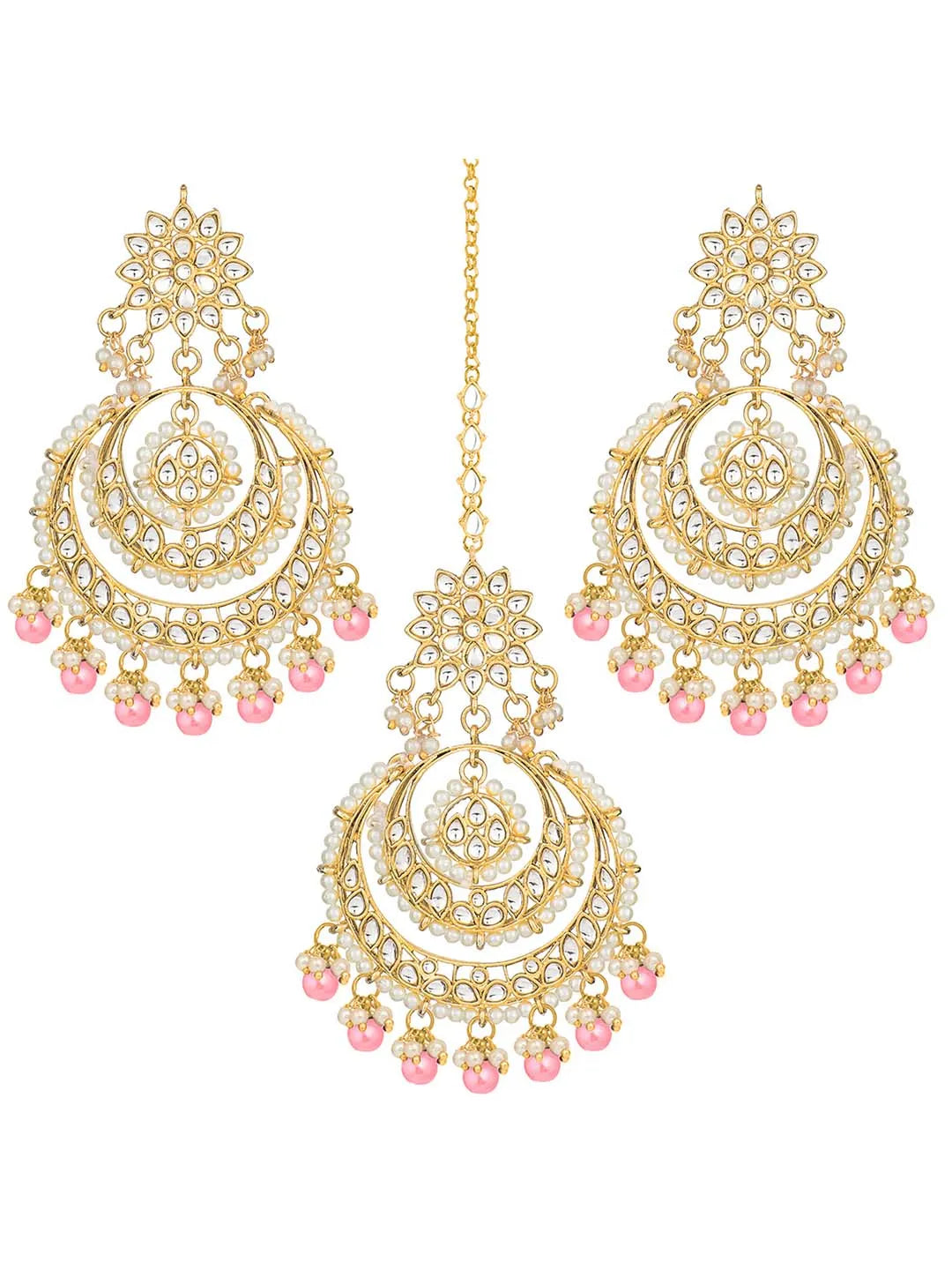 Product Name: Royal Radiance Kundan Pearl Maangtikka Earring Set - Pink