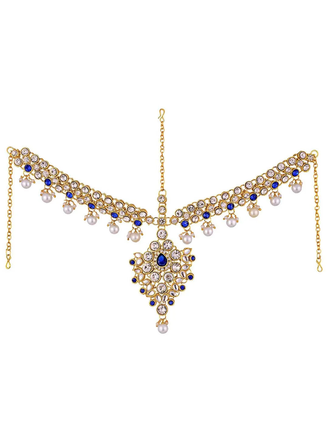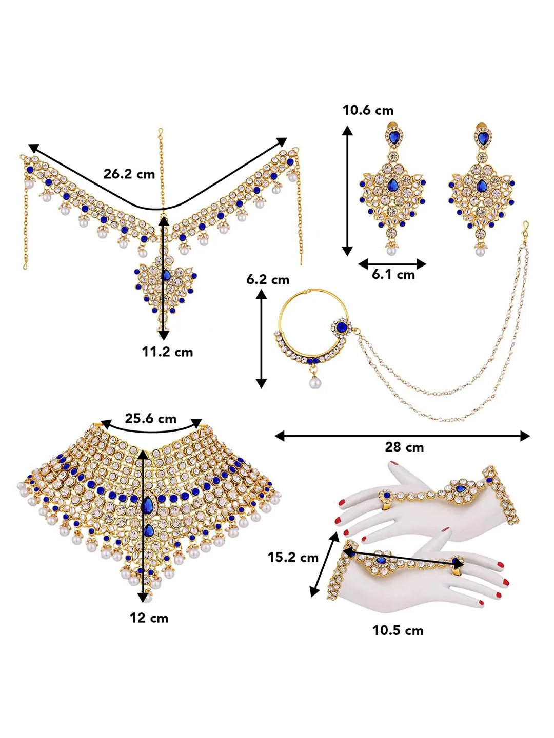 Dimensions: Necklace Length: 25.6 cm Width: 12 cm; Earrings Length: 10.6 cm Width: 6.1 cm; Nose Pin Ring-28 cm 6.2 cm; Haath Panja Length: 15.2 cm Width: 10.5 cm; Matha Patti Length: 26.2 cm Width: 11.2 cm