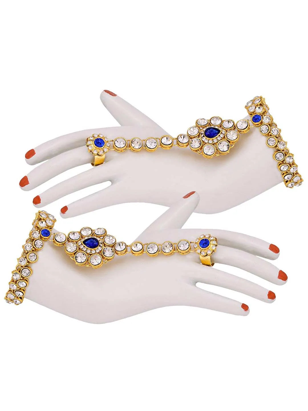In the Box: 1 Long Necklace 1 Short Necklace 1 Pair of Earrings 1 Nose Pin Ring 1 Pair of Haath Panja 1 Matha Patti 1 Set of Bangles