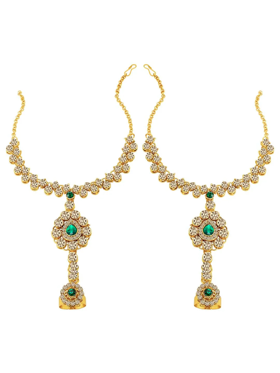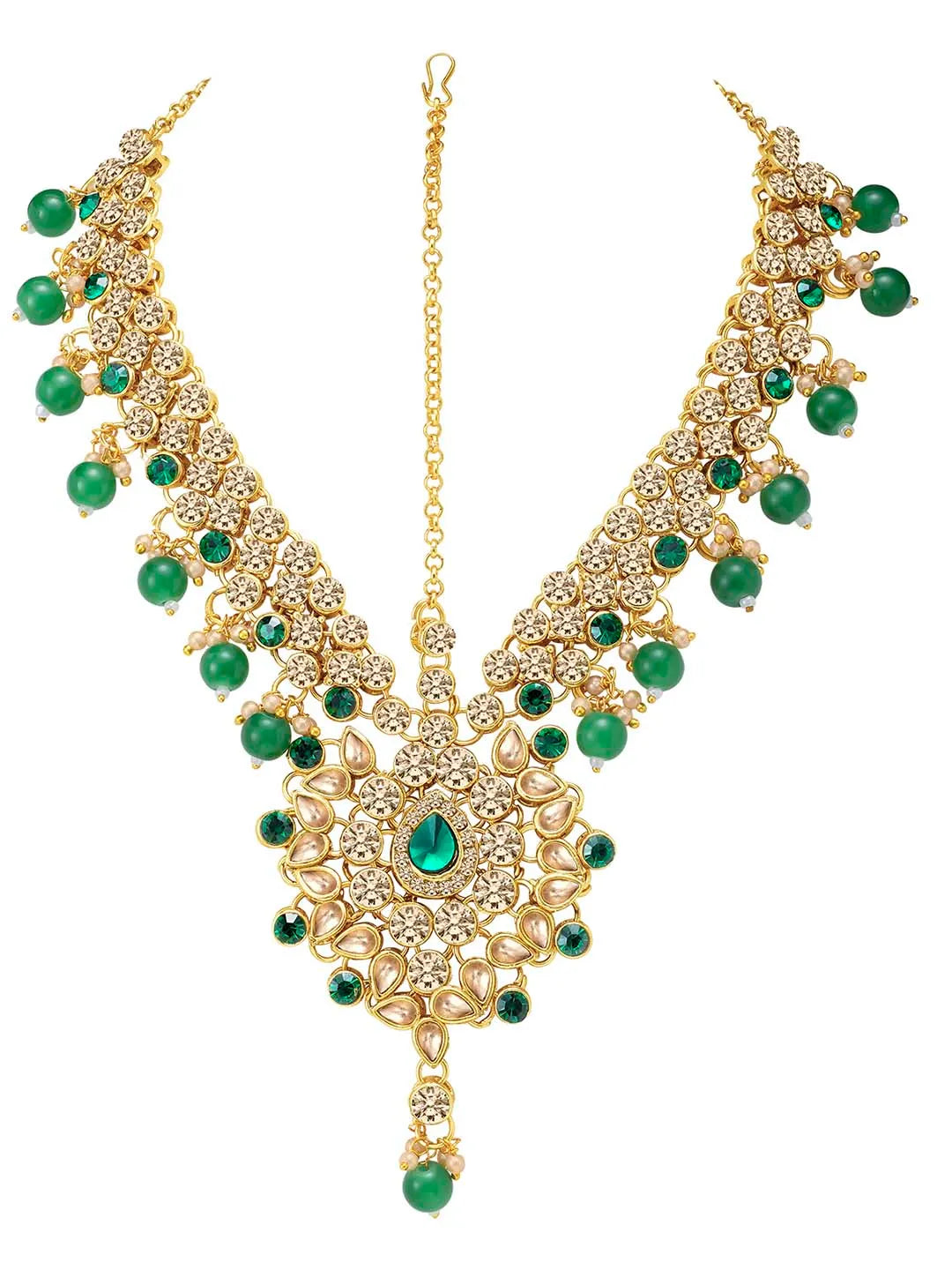 Dimensions: Necklace Length: 25.6 cm Width: 12 cm; Earrings Length: 10.6 cm Width: 6.1 cm; Nose Pin Ring-28 cm 6.2 cm; Haath Panja Length: 15.2 cm Width: 10.5 cm; Matha Patti Length: 26.2 cm Width: 11.2 cm