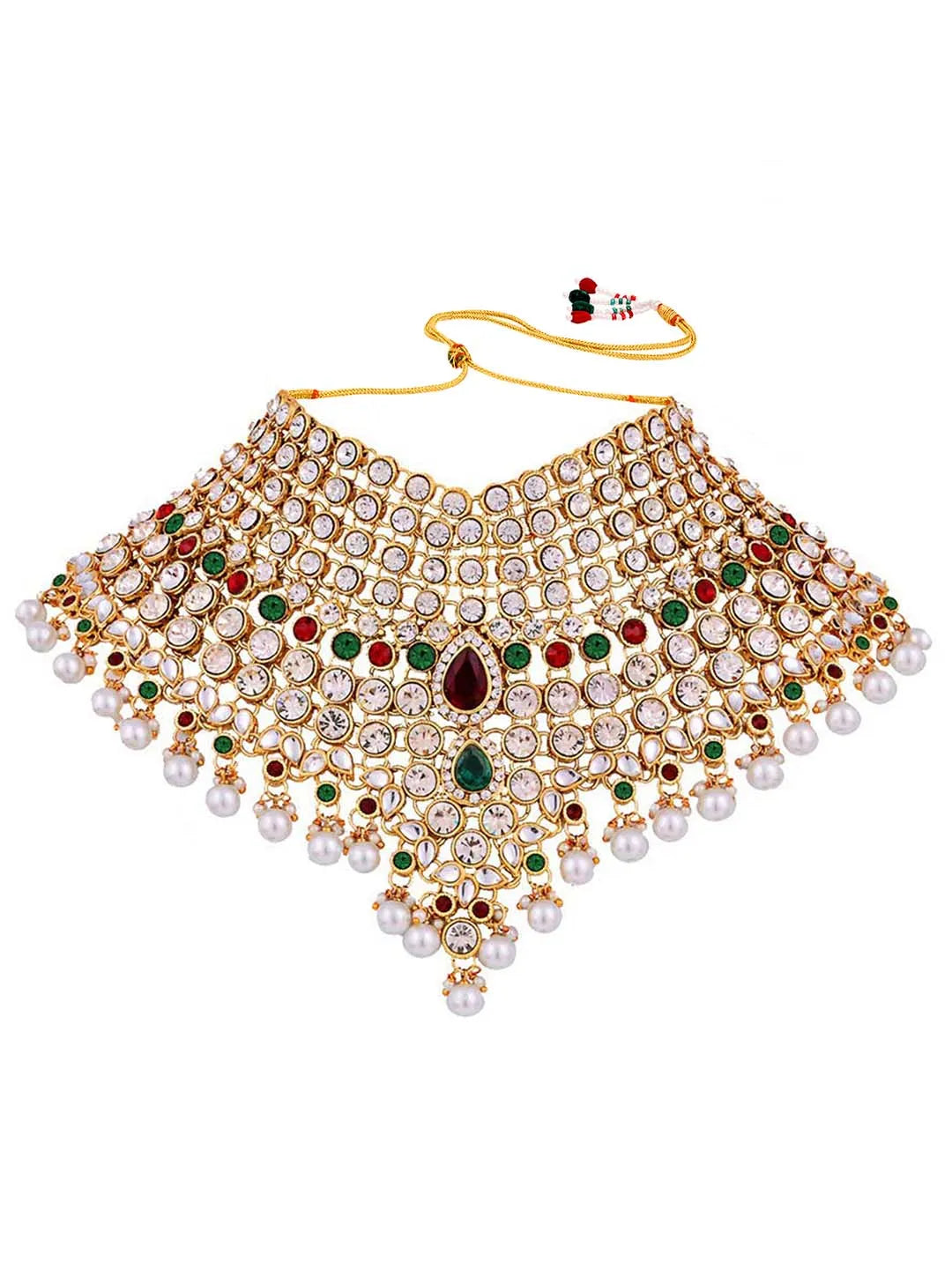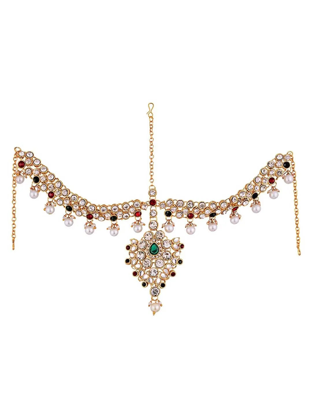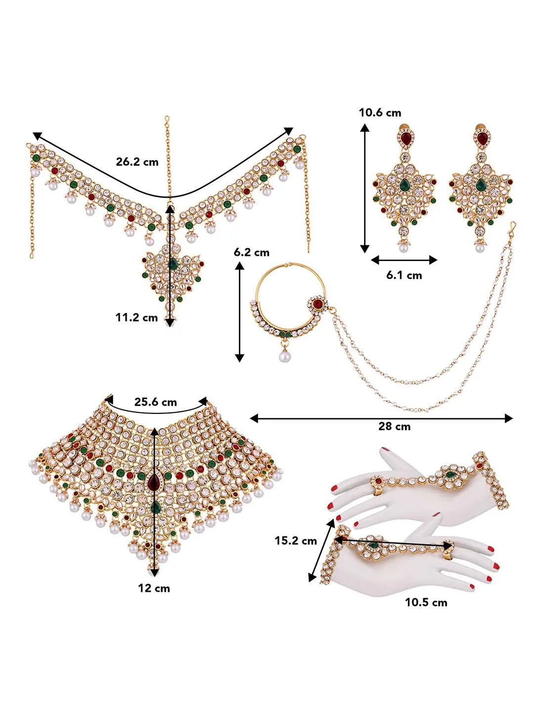 Dimensions: Necklace Length: 25.6 cm Width: 12 cm; Earrings Length: 10.6 cm Width: 6.1 cm; Nose Pin Ring-28 cm 6.2 cm; Haath Panja Length: 15.2 cm Width: 10.5 cm; Matha Patti Length: 26.2 cm Width: 11.2 cm