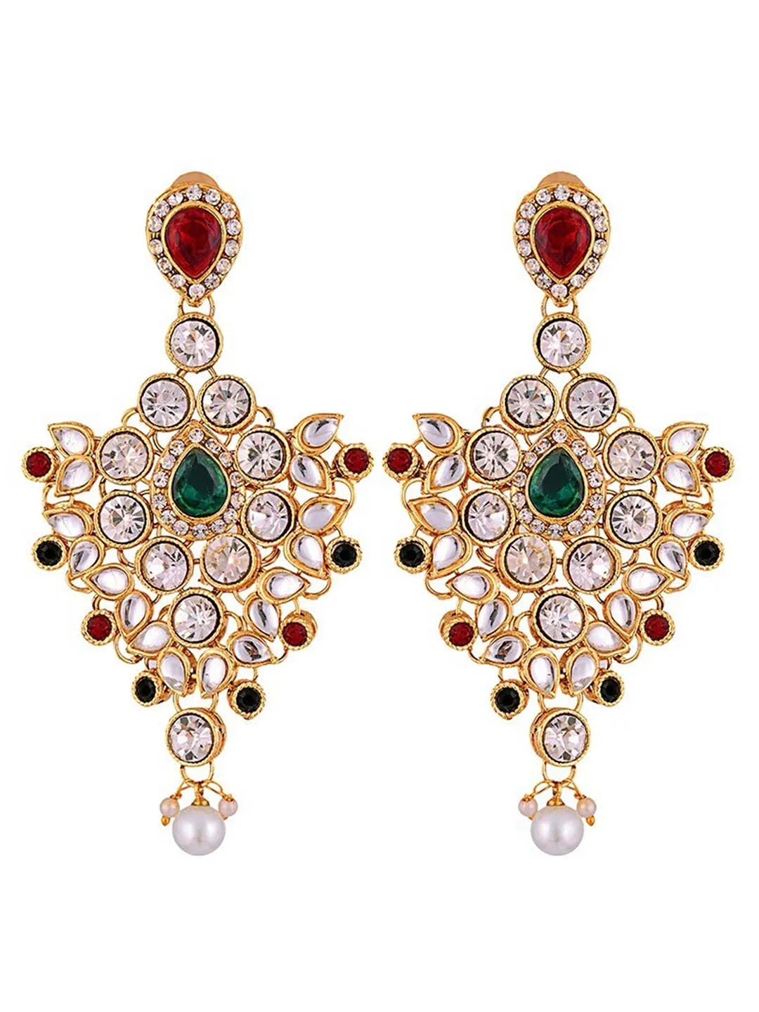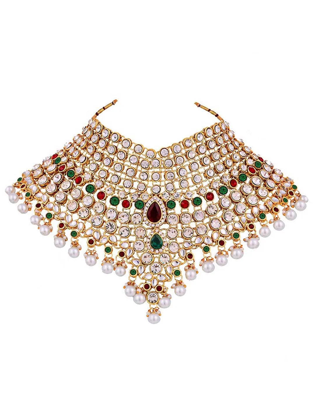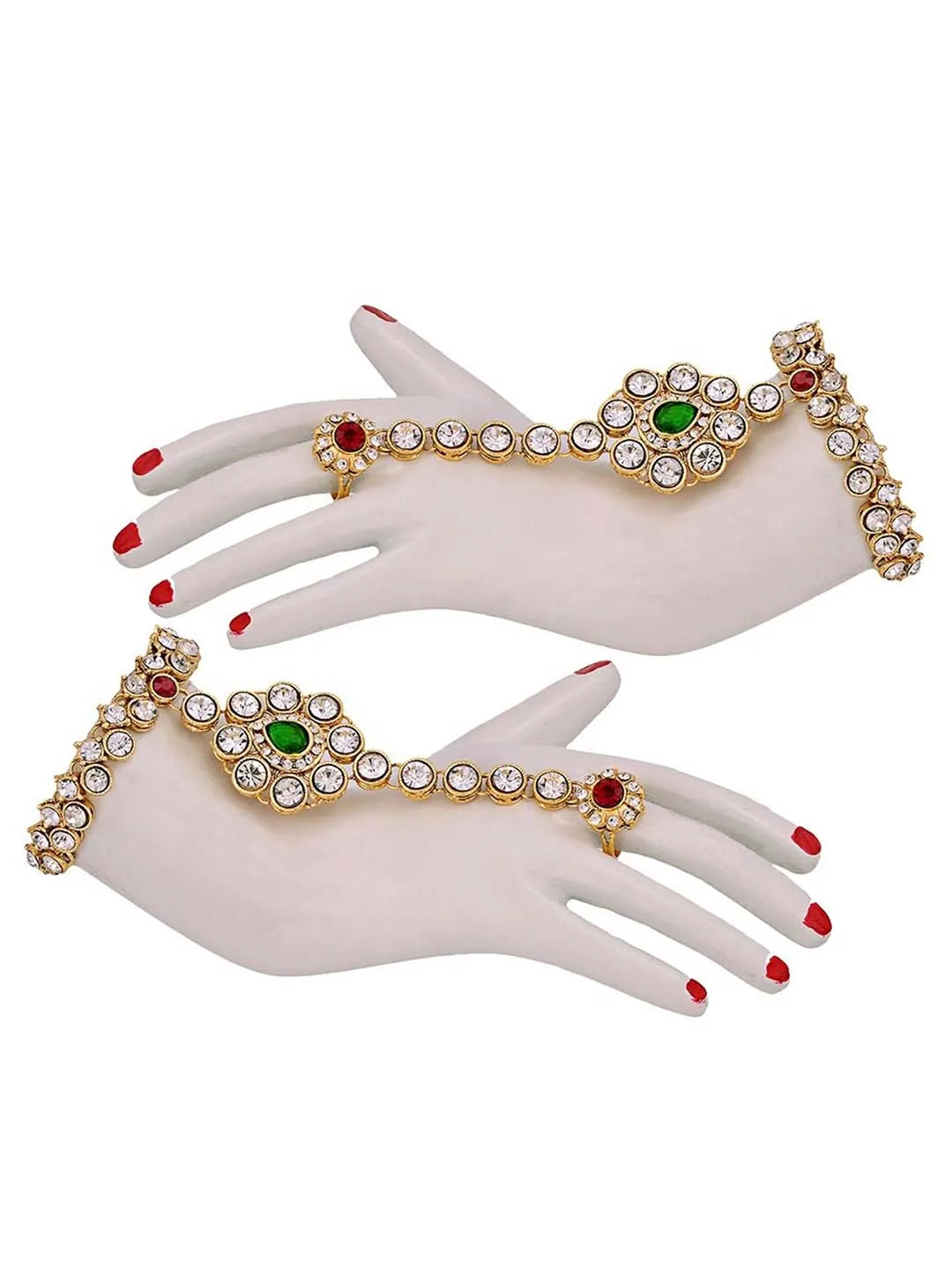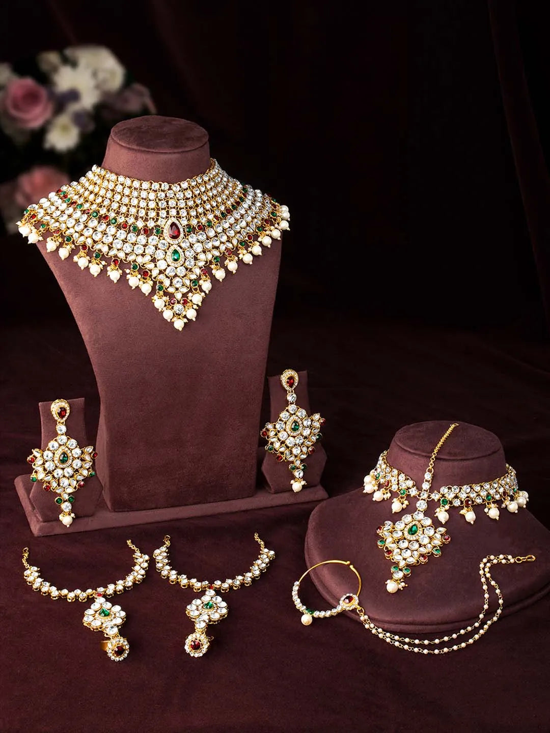 In the Box: 1 Long Necklace 1 Short Necklace 1 Pair of Earrings 1 Nose Pin Ring 1 Pair of Haath Panja 1 Matha Patti 1 Set of Bangles