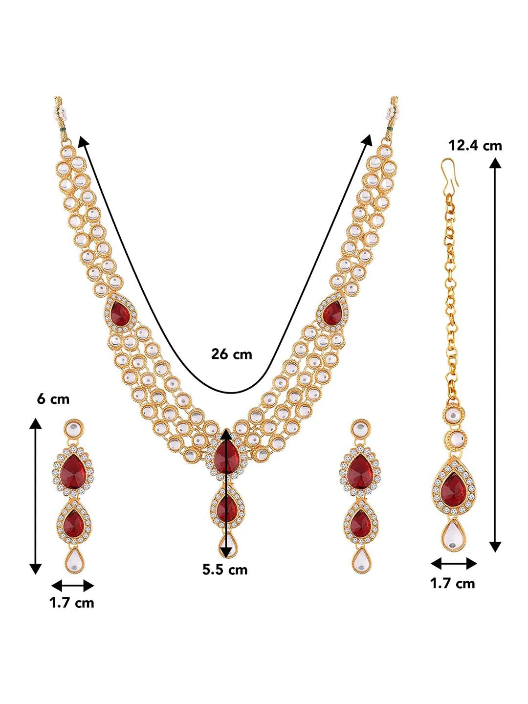 Dimensions: Necklace Length - 21 cm x Width - 4.5 cm , Earring Height - 6.5 cm x Width - 1.5 cm , Maang Tikka Length - 16.3 cm x Width - 1.5 cm