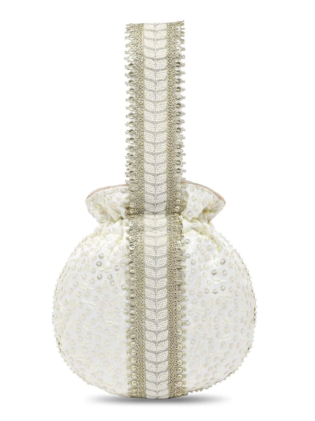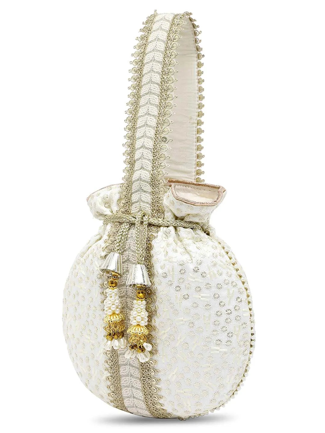 Product Name: Textile Charm Embroidery Potli Bag - White