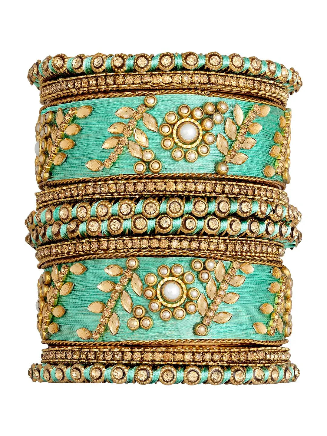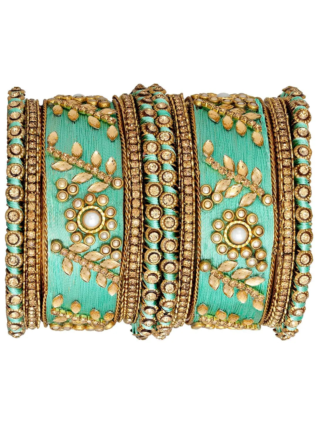 Product Name: Vibrant Kundan Bangles with Silk Threads - Light Green