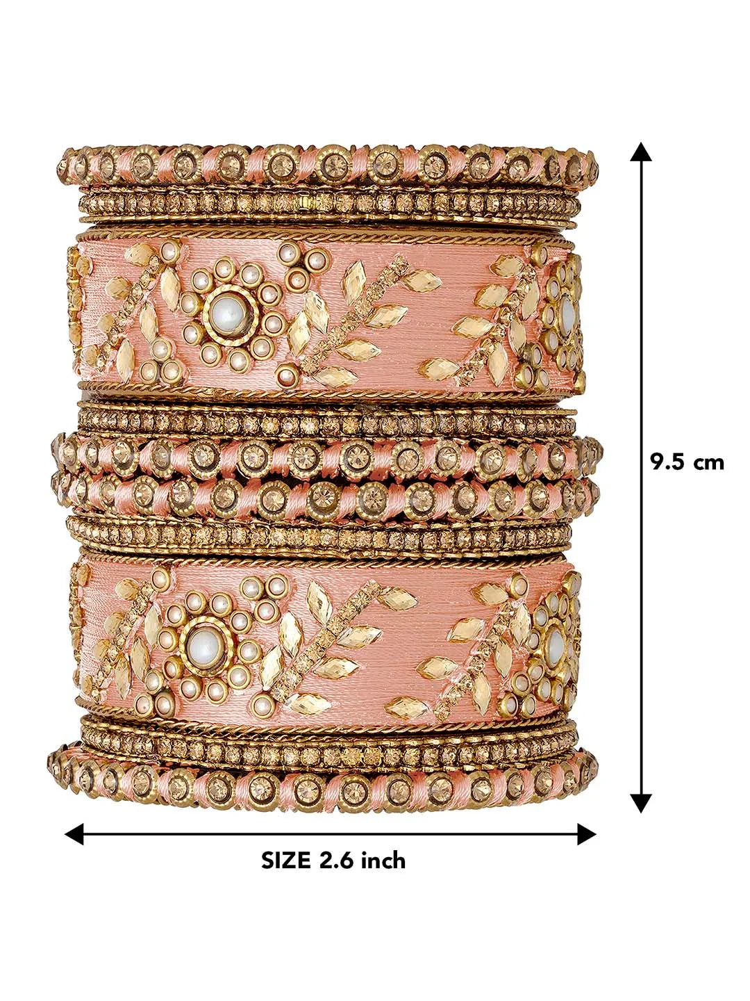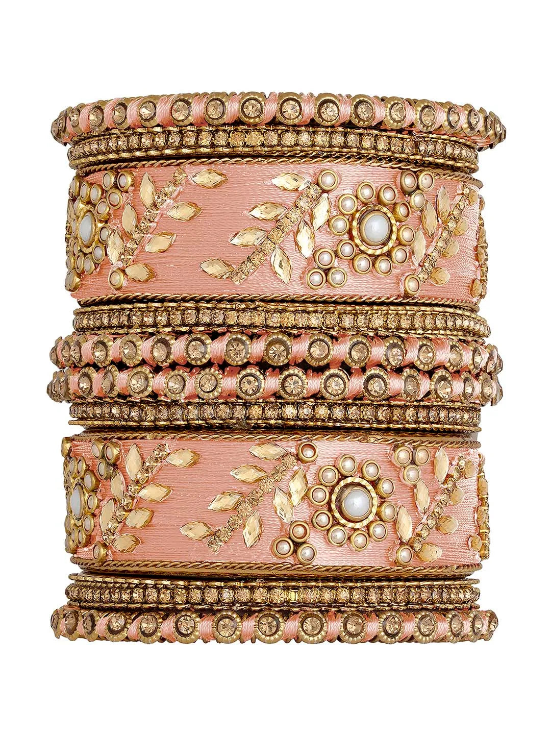 Product Name: Vibrant Kundan Bangles with Silk Threads - Peach